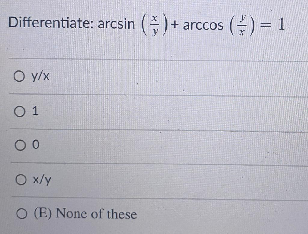 Solved Differentiate arcsin ()+ arccos ( ) = 1 O y/x O 1
