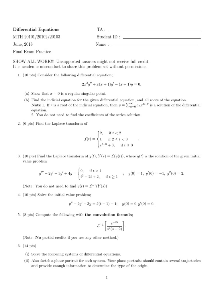 This section provides a final exam on differential equations, exam solutions, and a practice exam. You have three hours to. The following come from fall 2021; A pdf compilation of all problems.