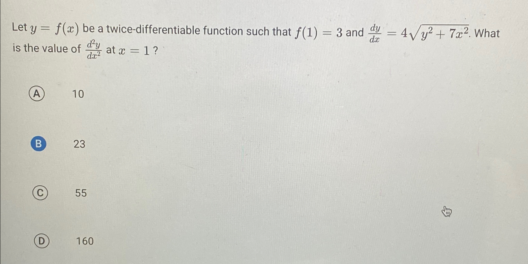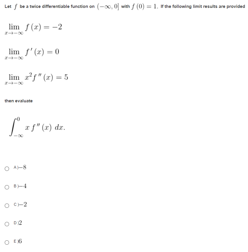 Let f be a function that is twice differentiable for all real numbers. The table above gives values. The correct answer is f(x)+∫0x (x−t)f'(t)dt=e2x+e−2xcos2x+2ax differentiating. Let $f$ be twice differentiable function on $(0,1)$.